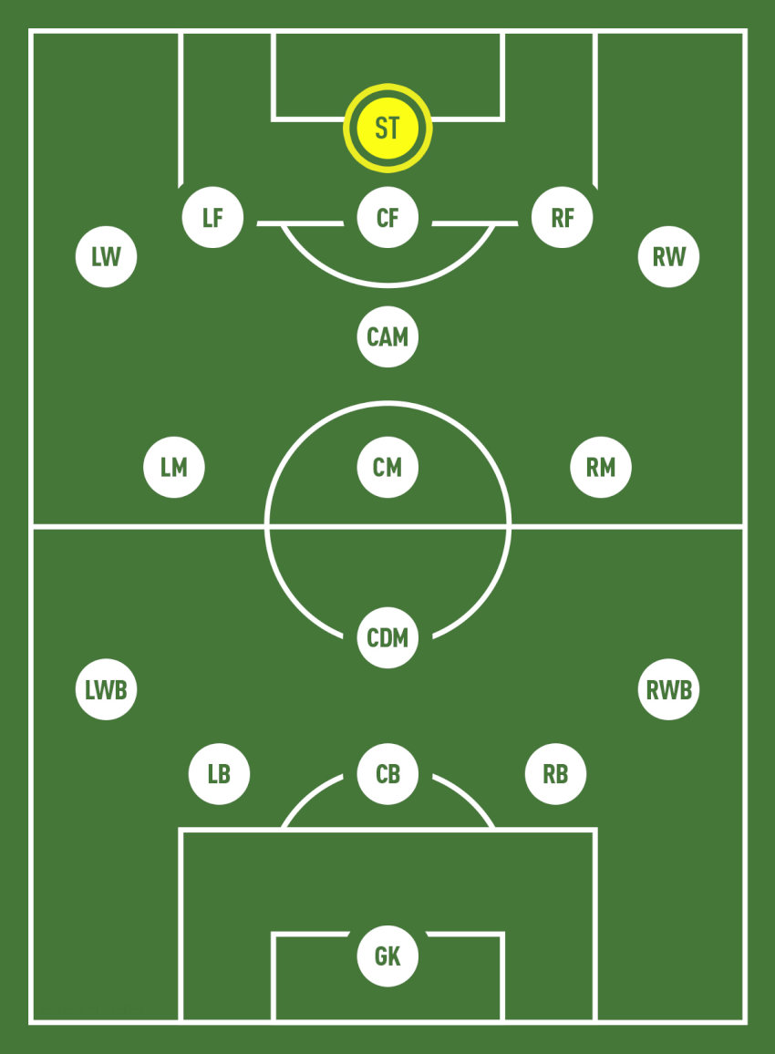Striker (st) là người chuyên săn bàn, tập trung tối đa vào việc tận dụng các cơ hội ghi bàn trong vòng cấm. Họ có tốc độ, khả năng dứt điểm sắc bén và luôn giữ tinh thần chiến đấu cao. Khác với cf, st ít di chuyển rộng mà chủ yếu đứng chờ bóng và kết thúc các pha bóng.